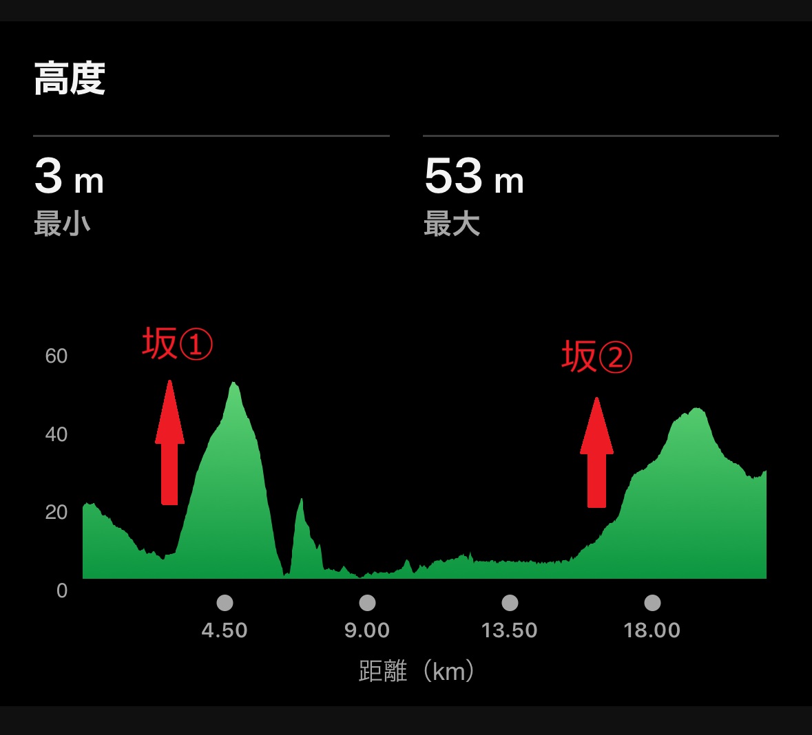 16㎞から19㎞までの坂(坂②)が地味にきつくて体力を奪われました。